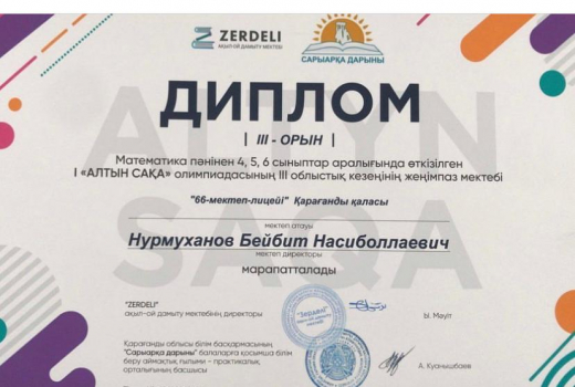 Математика пәнінен 4-сыныптар аралығында өткізілген "Алтын сақа" олимпиадасының облыстық кезеңінде ұшқыр ойымен 1-орын иеленген 4 А сынып оқушысы Мейірманқызы Фадиляны жеңісімен құттықтайм…
