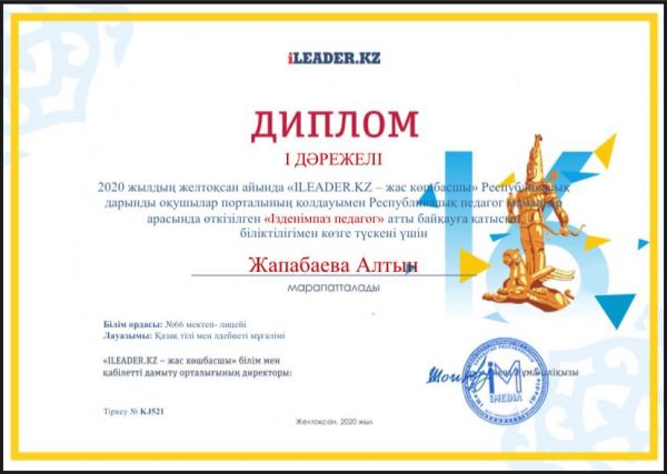Республикалық педагог мамандар арасында өткізілген "Ізденімпаз педагог" байқауында 1-дәрежелі дипломмен Жапабаева Алтын Секербаевнаны құттықтаймыз!