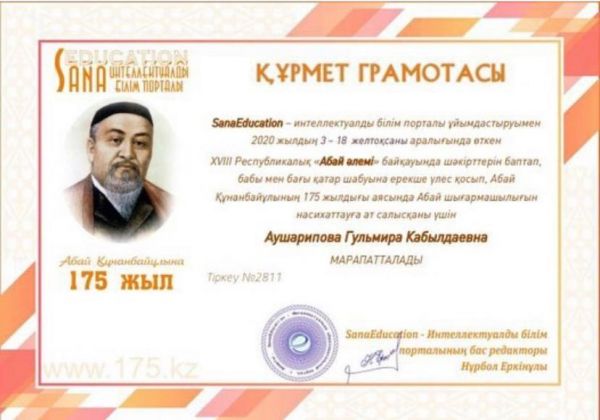 "Қабілет" білім порталының ұйымдастыруымен "Абайдың 175 жылдық мерейтойы" байқауына қатысып, Бас жүлдені иемденгені үшін 9"В" сынып оқушысы Керн Анна дипломмен марапатт…