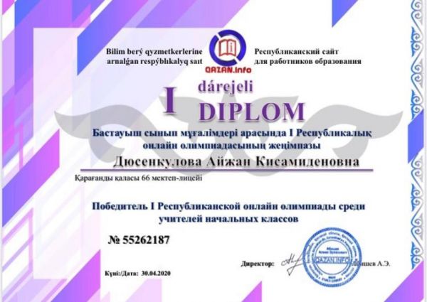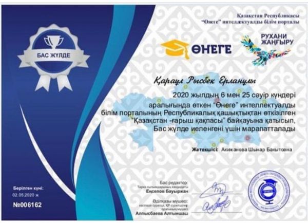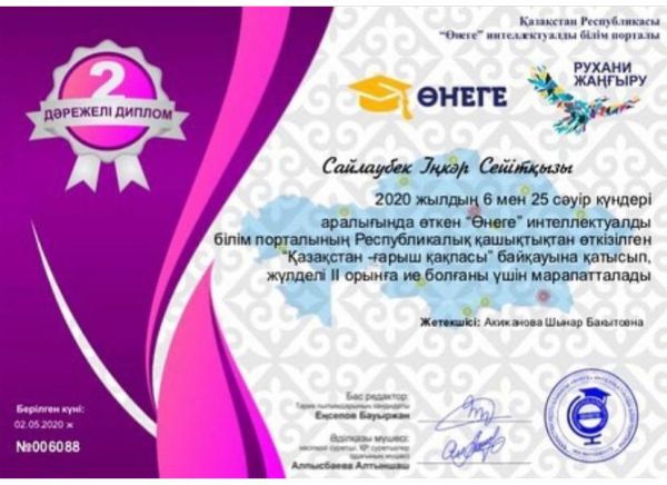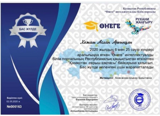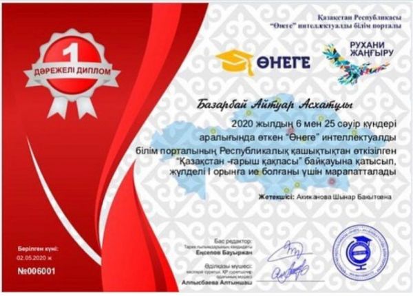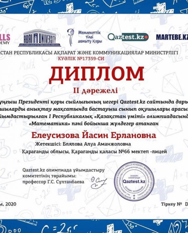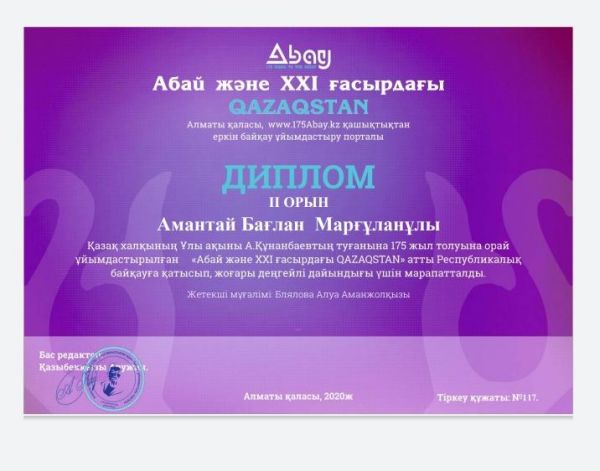 3 А сынып оқушысы Елеусизова Йасина Республикалық "Қазақстан үміті" сайысында математика және қазақ тілінен 2-дәрежелі дипломмен марапатталды. Білімің ұштала берсін Йасина!