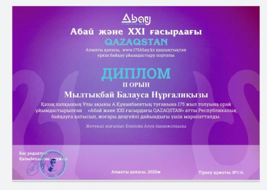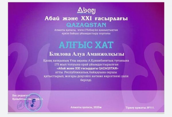 Республикалық "Абай және XXl ғасырдағы QAZAQSTAN" сайысына қатысқан 3 А сынып оқушылары Әбдіғалым Әмина 1-орын, Мылтықбай Балауса, Амантай Бағлан, Сағынбек Нұртілеу 2-орын Дипломдары…