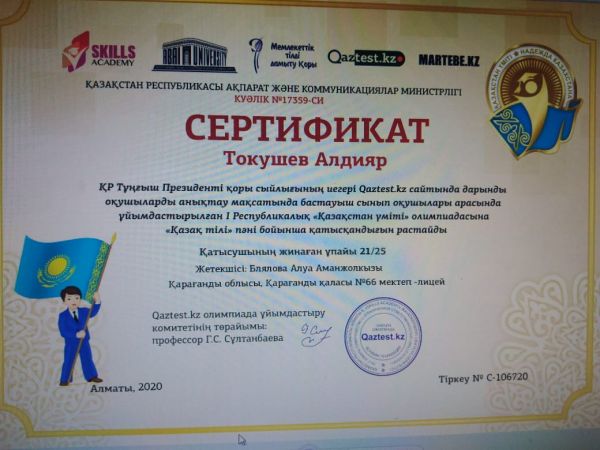 Республикалық "Қазақстан үміті " олимпиадасында "Қазақ тілі " пәні бойынша 2-дәрежелі дипломмен марапатталған 3А сынып оқушысы Токушев Алдиярды шын жүректен құт…