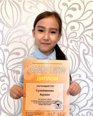 Сулейменова Аружан- ученица 1"Д" класса, стала победительницей международного конкурса "Золотое руно". 30 баллов из 30. Поздравляем! Учитель Третьякова Е.М.