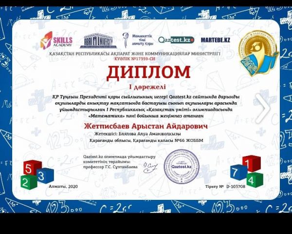 Республикалық "Қазақстан үміті" олимпиадасында "Математика" пәні бойынша 1-дәрежелі дипломмен марапатталған 3 А сынып оқушысы Жетписбаев Арыстанды шын жүректен құттық…