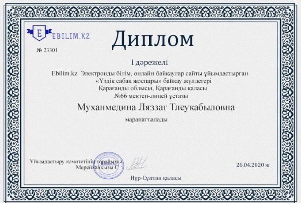 Құттықтаймыз!!! Республикалық «Үздік сабақ жоспары» байқауында №66 мектеп-лицей мұғалімі Муханмедина Ляззат Тлеукабыловна 1-нші жүлделі орынды жеңіп алды.