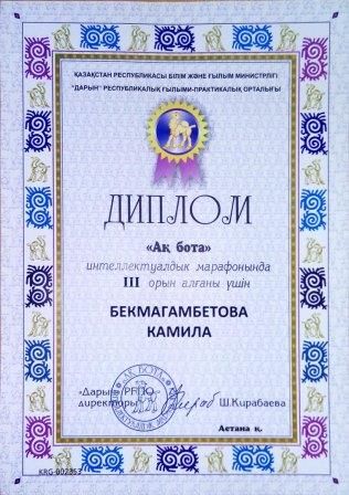 "Дарын" республикалық ғылыми-практикалық орталығы ұйымдастырған "Ақбота" интеллектуалдық марафонында 4 А сынып оқушылары III орын иеленді.