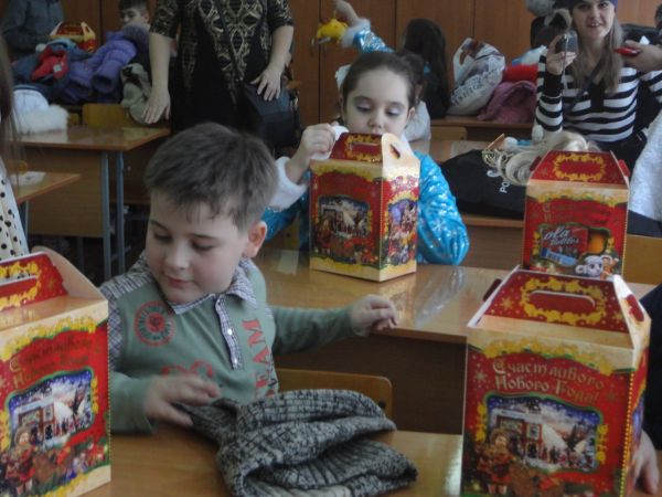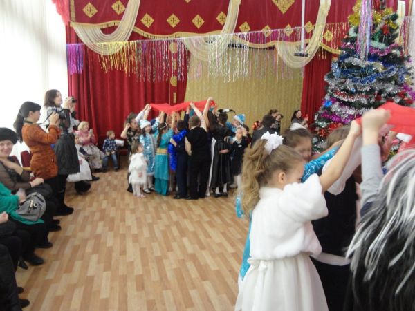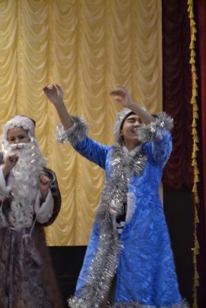 Социальный педагог Жуманова Динара с учениками 5 б класса Кальчевым Артемом и ученицей 2 класса Аиповой Дильназ посетили благотворительную елку Акима города. Которая состоялась 25 декабря 2014 года.