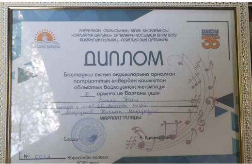 Бастауыш сынып окушыларына арналған патриоттық әндерден қашықтан облыстық байқауының lll орын жеңімпазы 3 сынып оқушысы Естай Ғани Саматұлы.