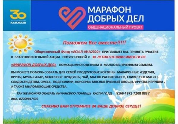 ✔ Ризашылық күні және «30 игі іс» қайырымдылық акциясы аясында «Мен туған жеріме ризамын» акциясын бастады.