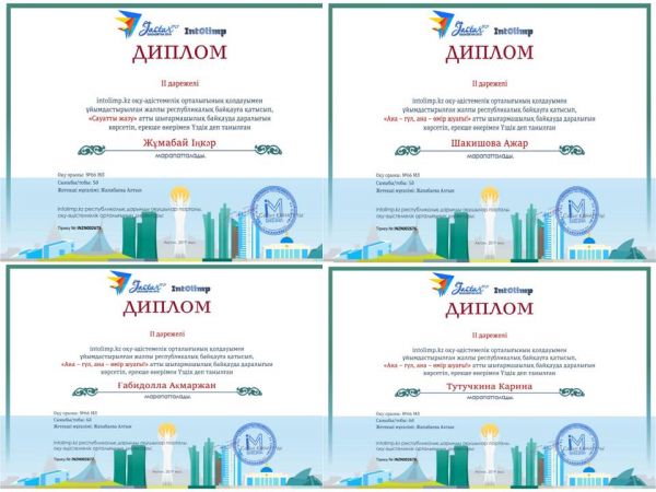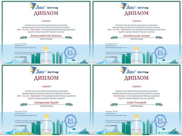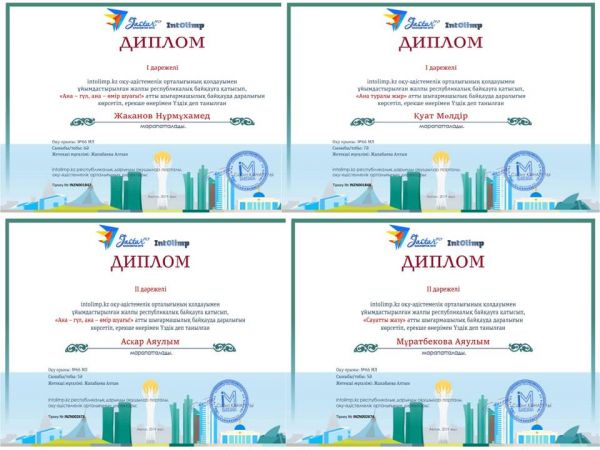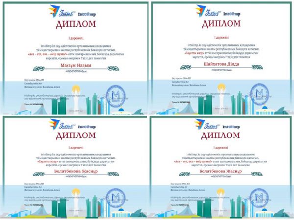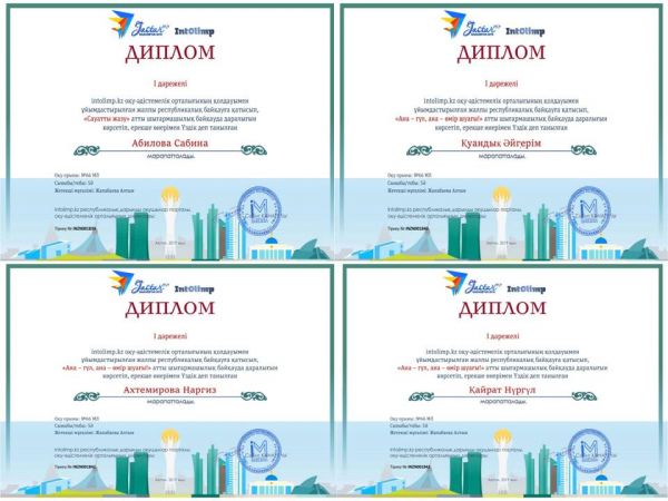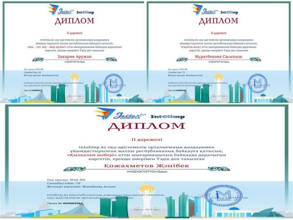 №66 мектептің 2 "А" лицей-сыныбының оқушылары халықаралық математикалық олимпиадаға қатысып, білімдерін сынап 1,2,3 орындарды иеленіп, Дипломмен марапатталды. Сынып жетекшісі: Блялова…