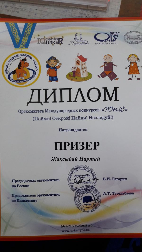 Халықаралық "Пони" дүниетану конкурсына қатысқан 4"Ә" сынып оқушысы Аипова Ділназ жеңімпаз атанды. Сынып жетекшісі: Блялова Алуа Аманжолқызы