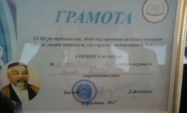 Бүгін 26.04.2017 жылы сегізінші республикалық Абай окуларынын қалалық кезеңінде жүлделі орын иегерін дайындаған ушин алғыс хатпен марапатталдым . 8 А сынып оқушысы Ершов Ярослав биринши орын алған у…