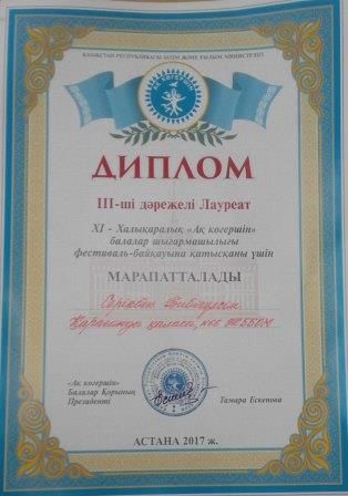 5 сынып оқушысы Серікбек Бибігүлсім (Муз.жетекшісі Максутов Н.М.) Астана қаласында өткізілген XI - Халықаралық "Ақ көгершін" фестиваль - байқауына қатысып, III- ші дәрежелі Дипломмен марап…