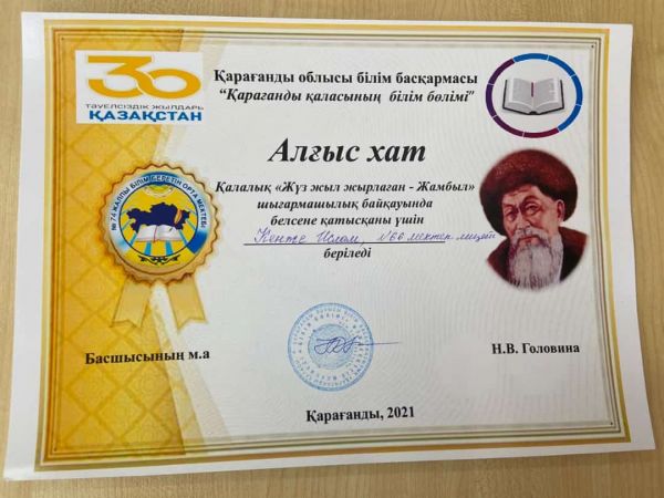 Қалалық "Жүз жыл жырлаған- Жамбыл" шығармашылық байқауында "Эссе" номинациясы бойынша 9ә- сынып оқушысы Амангелді Ердос 3-орын алды.