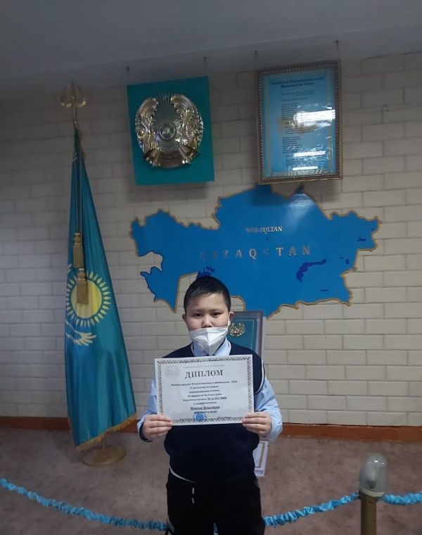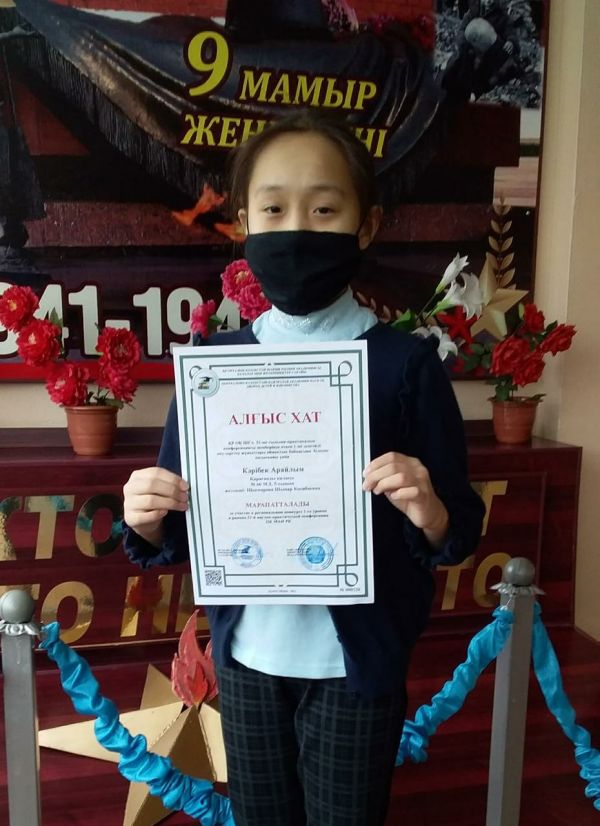 ҚР ОҚ ШҒА 51-ші ғылыми-практикалық конференциясы шеңберінде өткен 1-ші деңгейлі оқу-зерттеу жұмыстары аймақтық байқауына белсене қатысқаны үшін 5ә сынып оқушысы Кәрі…