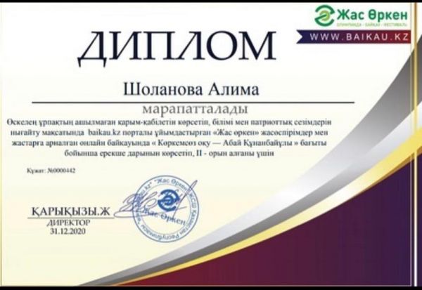 "Жас өркен" жасөспірімдер мен жастарға арналған онлайн байқауға қатысып, жүлделі ll орынды иеленген 3 А сынып оқушысы Шоланова Алиманы құттықтаймыз! Сынып мұғалімі Кошикова Мағрипа Балтаба…