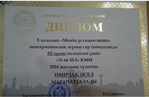 Құттықтаймыз!!! X қалалық ,, Менің ұстазым- 2020,, шығармашылық байқауында қазақ тілі мен әдебиет пәні мұғалімі Муханмедина Ляззат Тлеукабыловнаның 2016 жылғы түлегі Өмірзақ Әсел дипломмен марапатта…