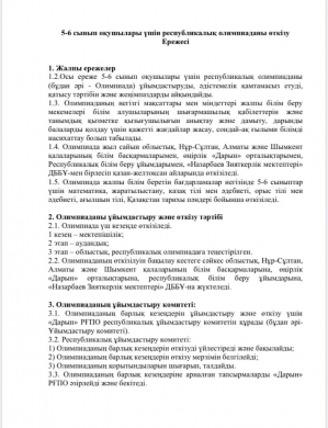 1.2.Осы ереже 5-6 сынып оқушылары үшін республикалық олимпиаданы (бұдан әрі - Олимпиада) ұйымдастыруды, әдіс…