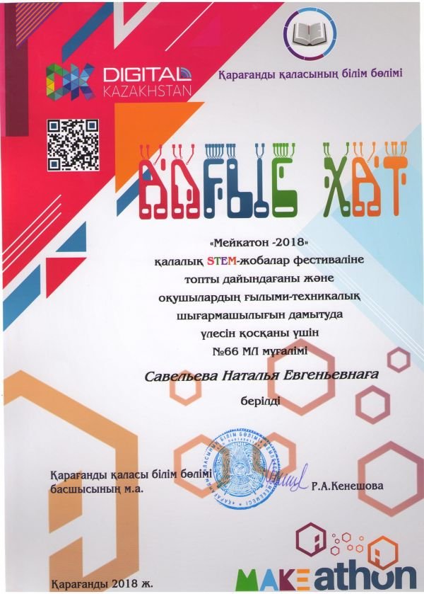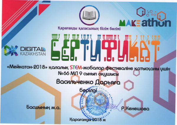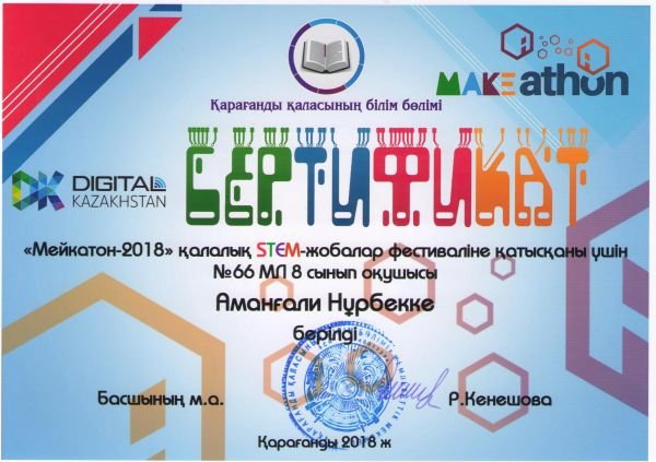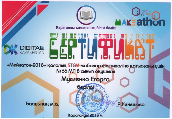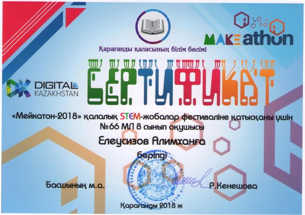 24.12.2018 ж №39 гимназияда "Мейкатон-2018" қалалық STEM жобалар фестивалі өтті. Жарысқа біздің мектептен оқушыларымыз қатысып, сертификаттарға ие болды.