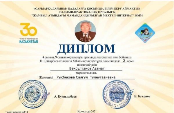"Сарыарқа дарыны"балаларға қосымша білім беру аймақтық Ғылыми-практикалық орталығы өткізген 4сынып, 9сынып оқушылар арасында математика пәні бойынша Н.Қайырбаев атындағы ХІІ аймақтық дәстү…