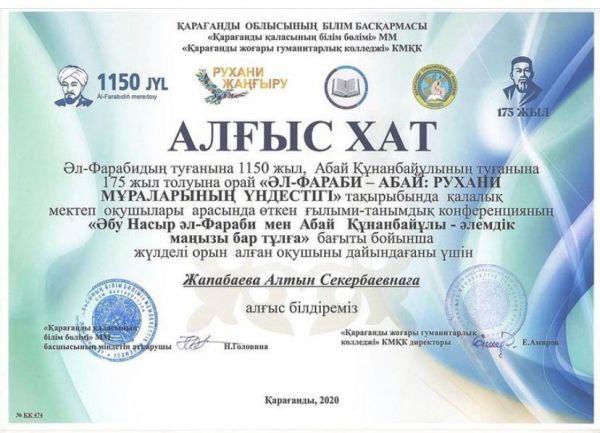 Әл- Фарабидың туғанына 1150 жыл және Абай Құнанбайұлының туғанына 175 жыл толуына орай "Абай- Әл Фараби" ғылыми - танымдық конференциясында 9ә- сынып оқушысы Ахмет Әли жүлделі 1-орын алды…