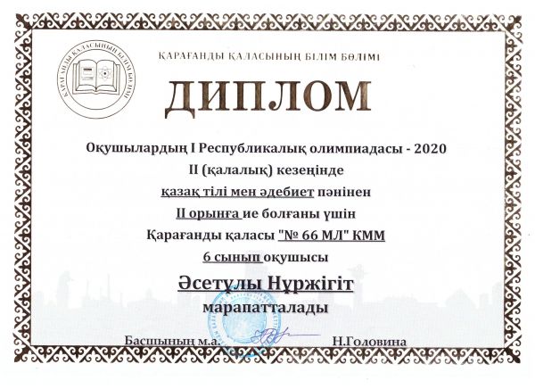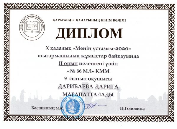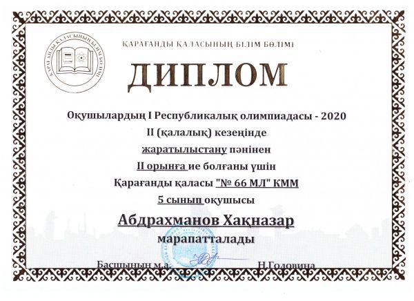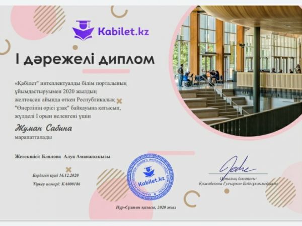"Қабілет" интелектуалды білім порталының ұйымдастыруымен желтоқсан айында өткен Республикалық "Өнерлінің өрісі ұзақ " байқауына қатысып, жүлделі І-орын иеленгеі үшін 4А сын…