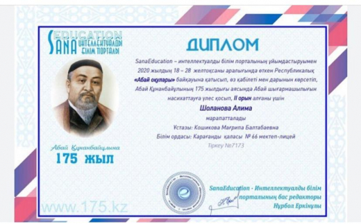 XlX Республикалық "Абай әлемі" байқауына шәкірттер тәрбиелеп, Абай Құнанбайұлының 175 жылдығы аясында Абай шығармашылығын насихаттауға…