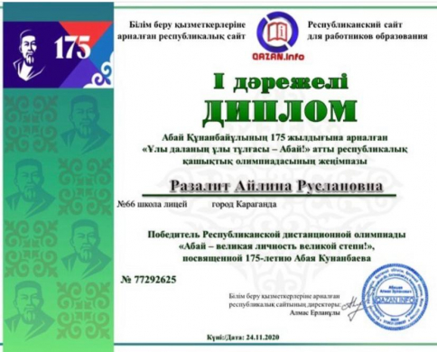 Абай Кұнанбайұлының 175 жылдығына арналған «Ұлы даланың ұлы тұлғасы - Абай!» атты республикалық қашықтық олимпиадасының жеңімпазыдары!