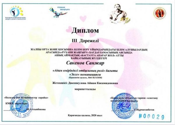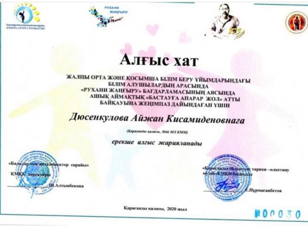 "Жыл оқушысы-2020 атағы біздің қанжығамызға байланды. Бас жүлде иеленген- 8ә сынып оқушысы Серікбек Бибігүлсімді шын жүректен құттыктаймыз! Сайысқа дайындаған сынып жетекшісі Жапабаева Алты…