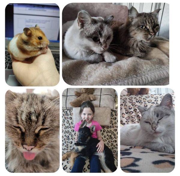 Шмидт Михелина 3б класс. Это все мои питомцы: щенок по кличке Тера, хомяк Саймон, кошка Синда, кошка Муся и кот Тоша. Мы их всех очень любим.