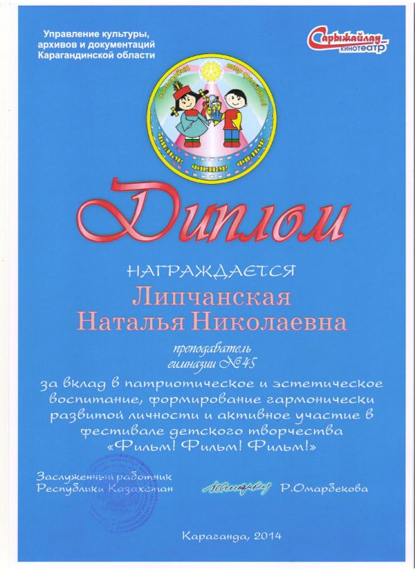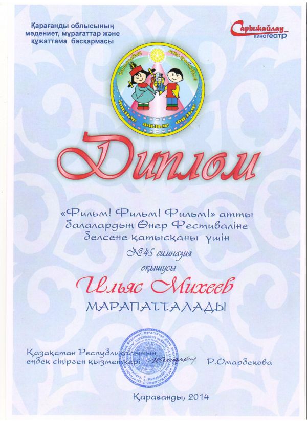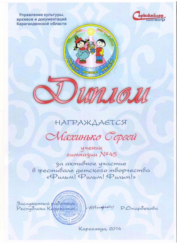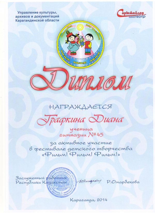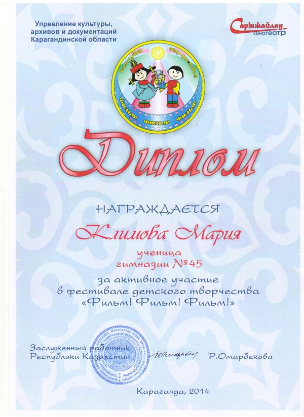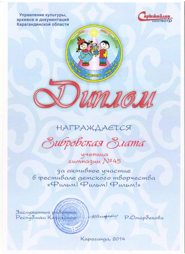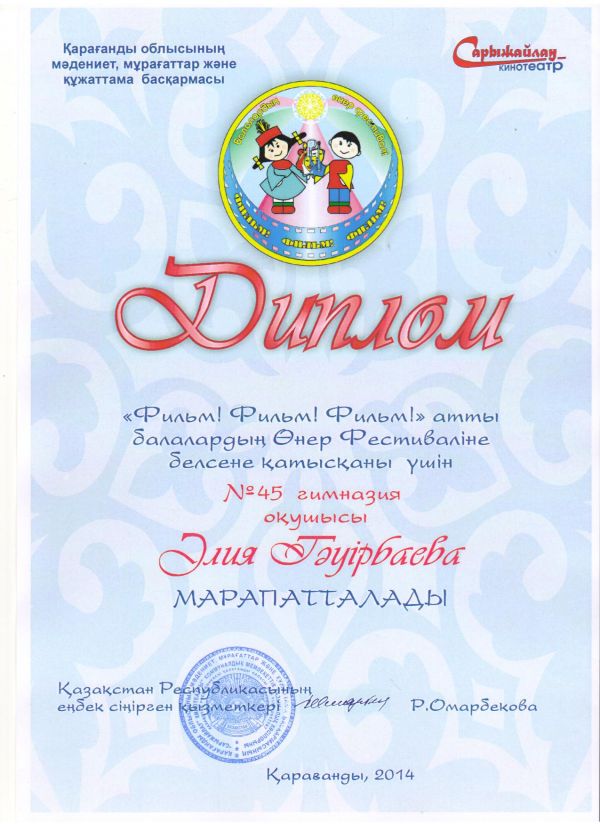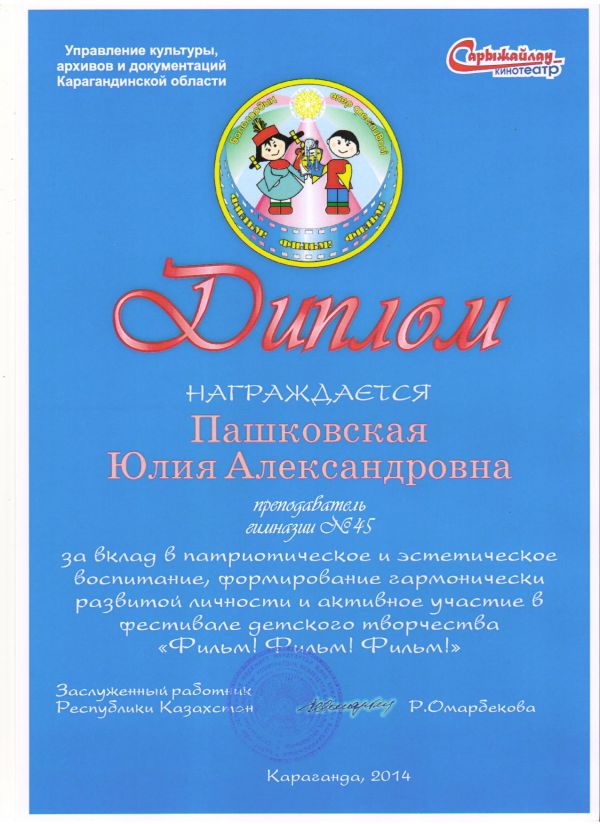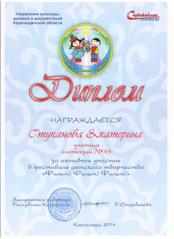 20-21 ноября 2014 года учащиеся КГУ Гимназии№45 , приняли активное участие в детском фестивале искусств "Фильм, фильм, фильм", который проходил в кинотеатре "Сарыжайлау";возрастн…