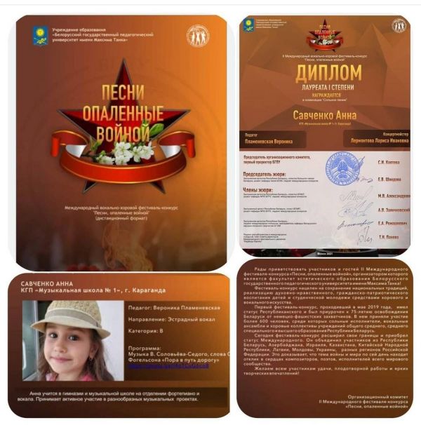 С 7 по 9 мая в Минске прошел Международный вокально- хоровой фестиваль - конкурс "Песни, опаленные войной", в котором приняла участие ученица 4 "В" класса - Савченко Анна.