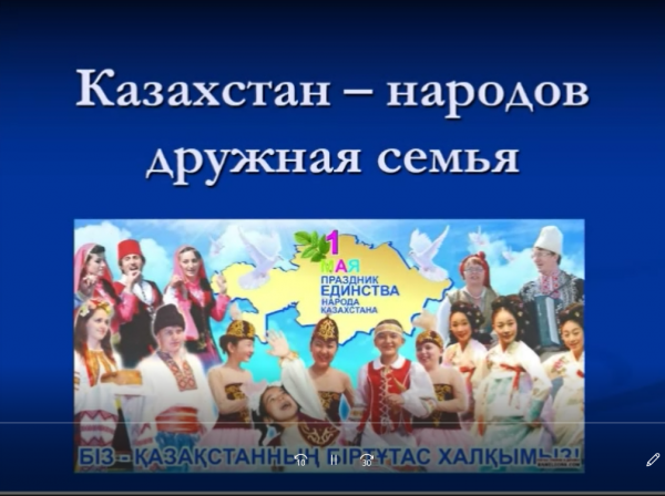 27 апреля в 7 «В» классе на платформе Google Classroom, прошёл классный час на тему «Казахстан – народов дружная семья!», посвященный Дню единства народа Казахстана.