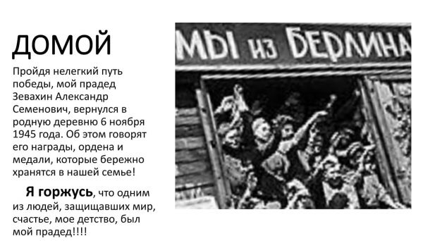 День Победы практически для каждой семьи — это святой праздник. В 1939–1945 гг. за мир отдали жизни и здоровье миллионы советских граждан. Верили в него и наши прадеды, проливая кровь и…