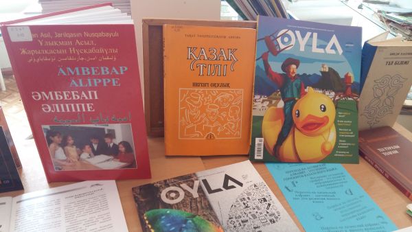 Учащимся разъясняется, что латинская графика используется на современном этапе во многих странах, настало время для модернизации казахского языка. На выставке были представлены книги на латинице, но…