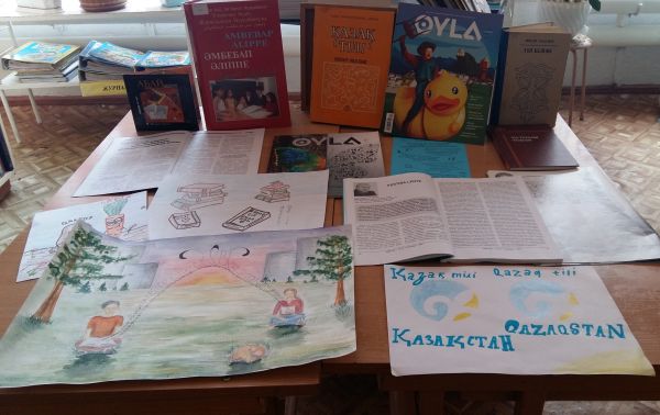 В гимназии организована выставка по переходу казахского языка на латиницу.