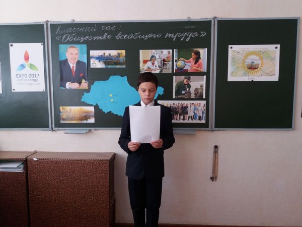 Сынып сағатында оқушылар «Жалпыға ортақ еңбек қоғамы» туралы елбасымыз Нұрсұлтан Әбішұлы Назарбаевтың айтқан идеялары туралы білді.
