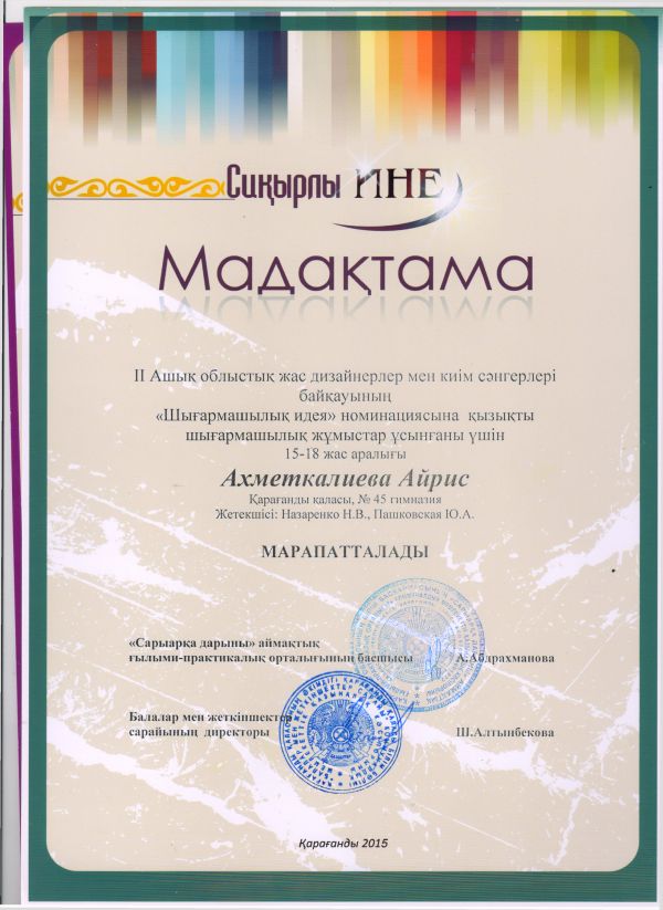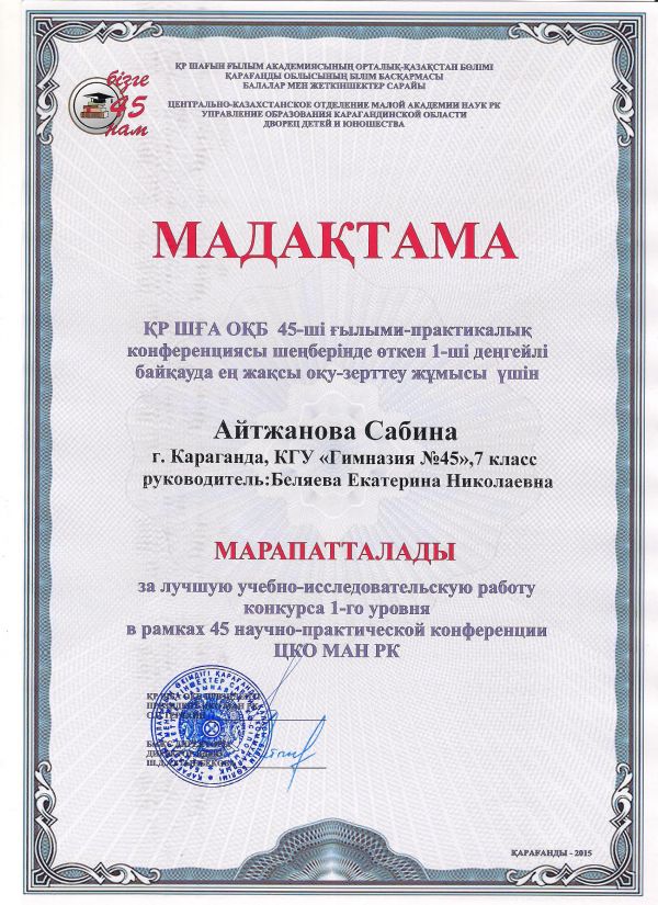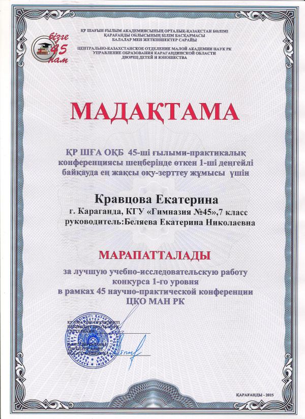 Поздравляем! Кравцову Екатерину, Айтжанову Сабину  за лучшую учебно-исследовательскую работу конкурса 1-го уровня в рамках 45 научной- практической конференции ЦКОМАН РК