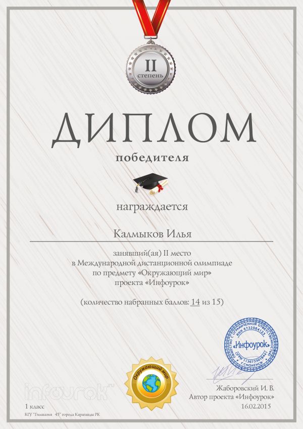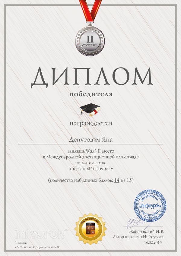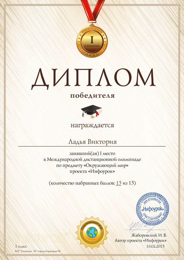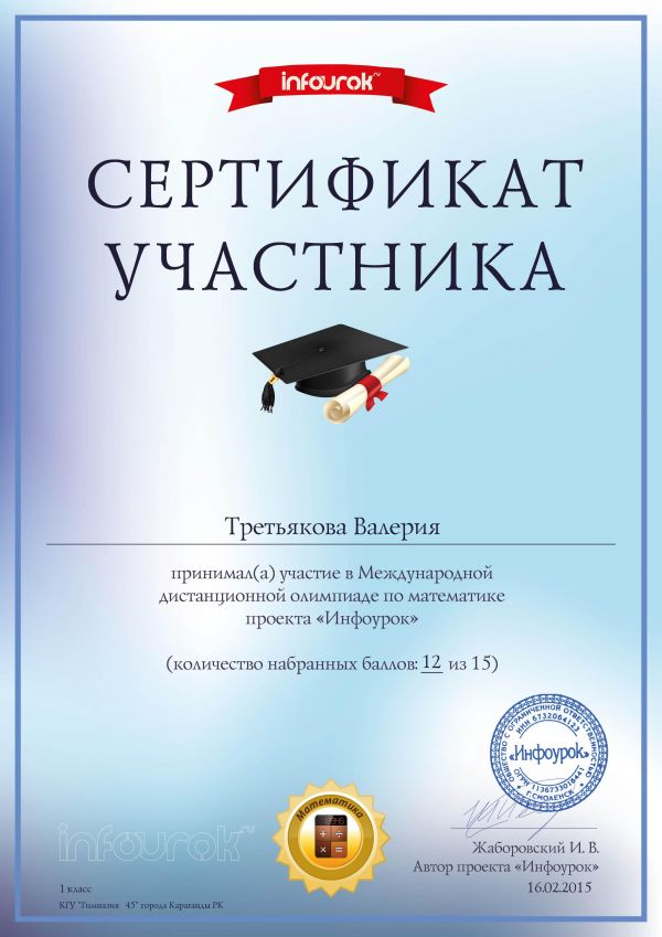 Результаты участия учащихся 1-Б класса в Международной дистанционной олимпиаде среди начальных классов проектов «Инфоурок»
