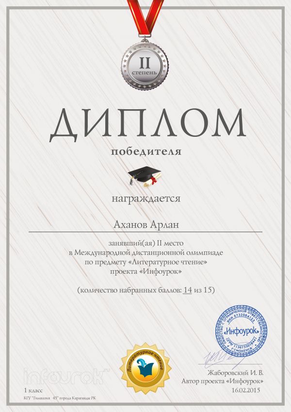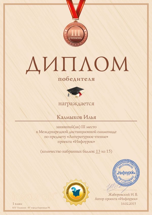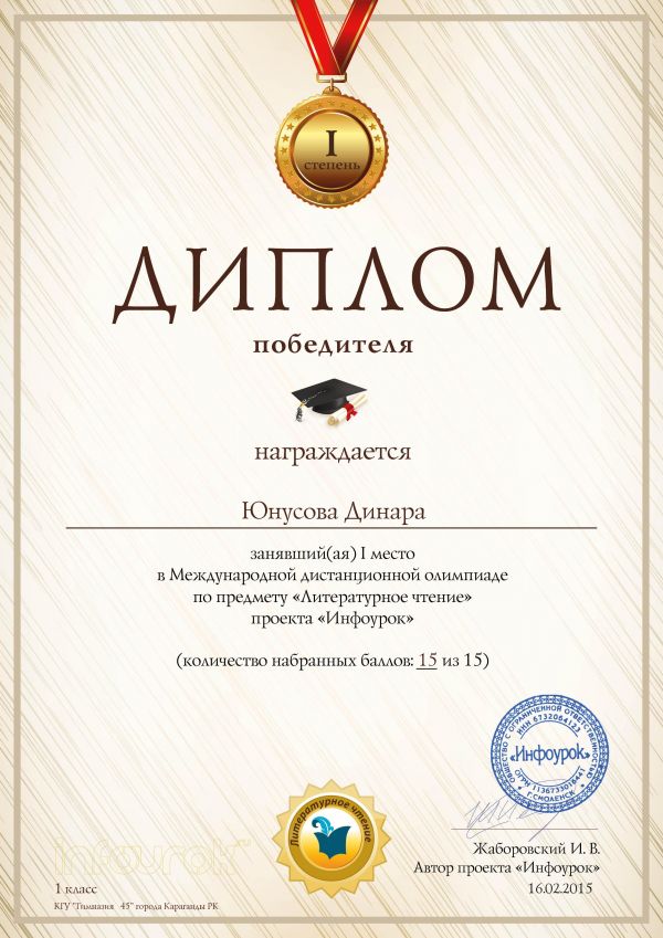 Результаты участия учащихся 1-Б класса в Международной дистанционной олимпиаде среди начальных классов по литературе в  проекте «Инфоурок»