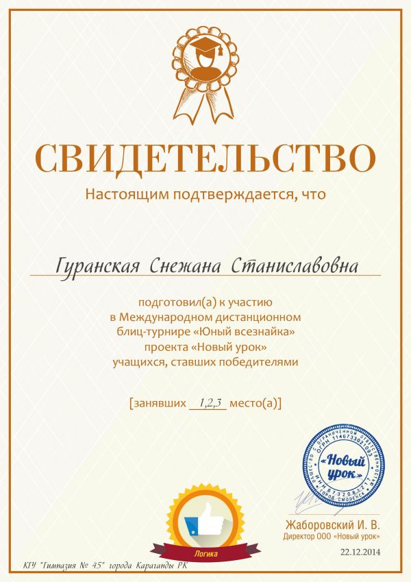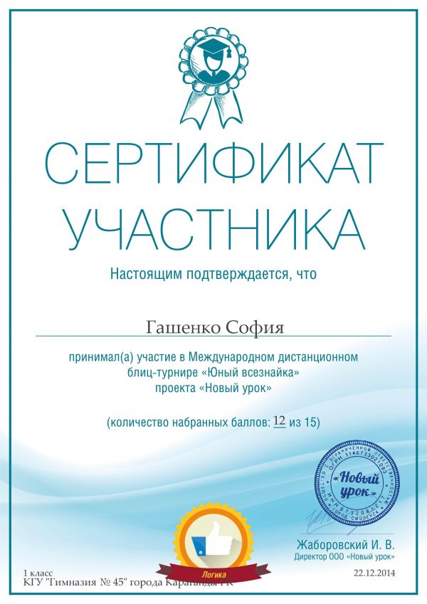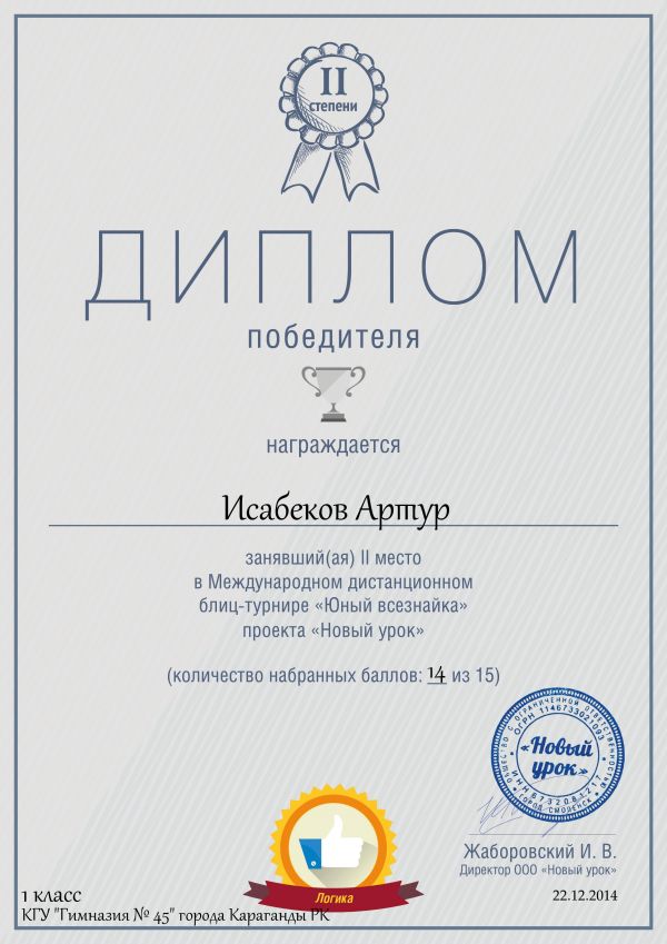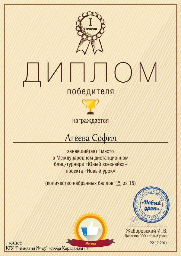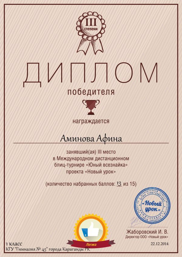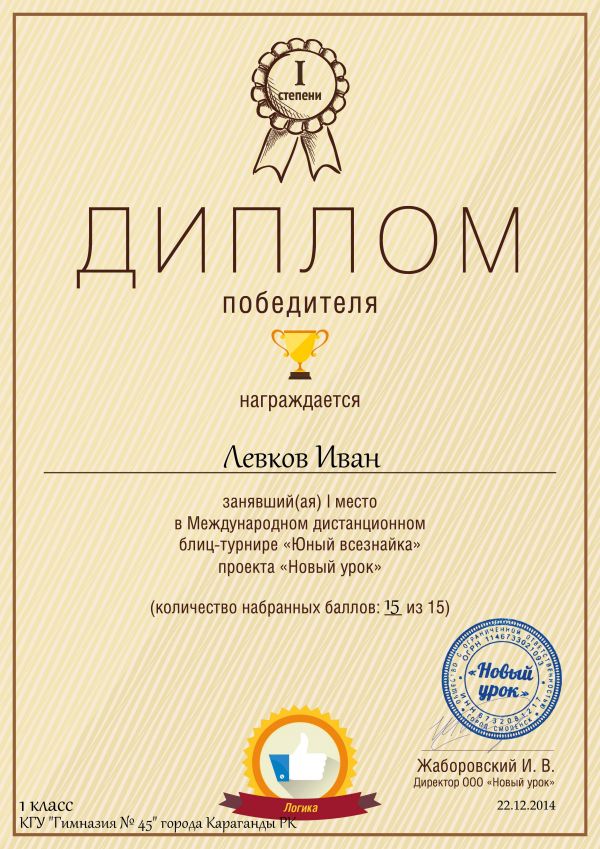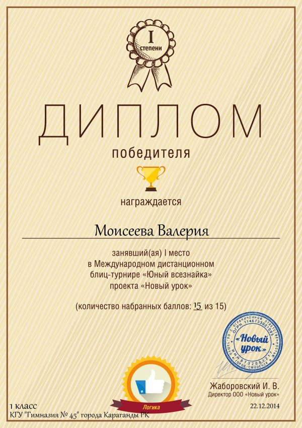 Результаты участия учащихся 1-Б класса в Международной дистанционной олимпиаде среди начальных классов по логике в  проекте «Новый урок»