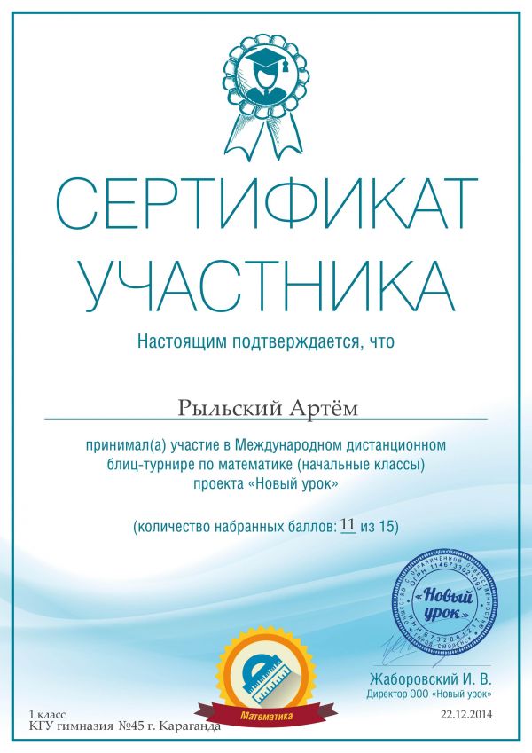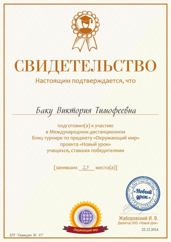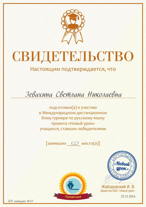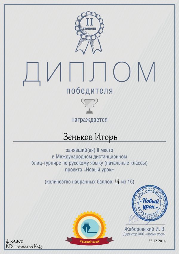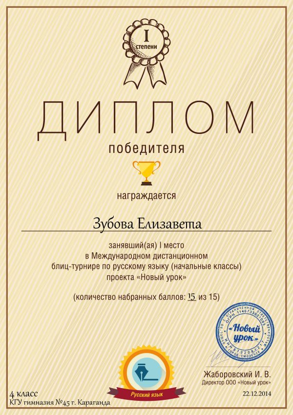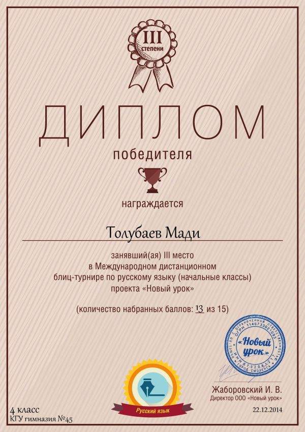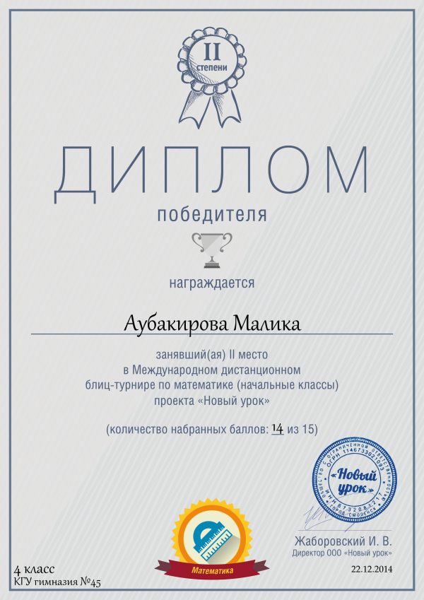 Поздравляем победителей 4а класса в Международной дистанционной олимпиаде по русскому языку проекта «Новый урок» учащихся КГУ № 45