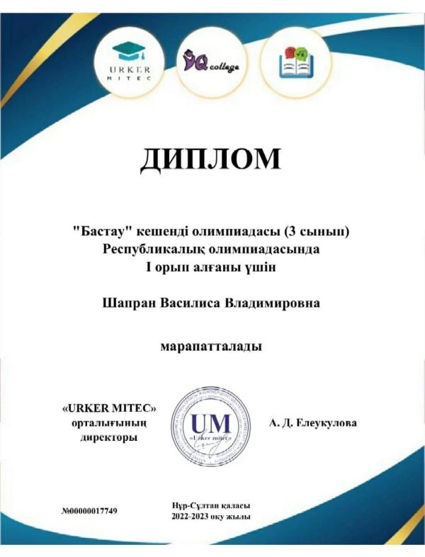 Шапран Василиса, ученица 3 а класса, приняла участие в Комплексной олимпиаде "Бастау" по математике.