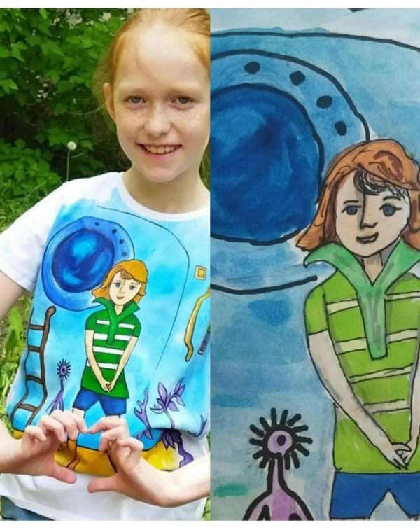 Алексеенко Виктория, 4 А класс. Вместе со своей семьей приняла участие в выставке творческих работ "Семейная мастерская ". Футболка своими руками.