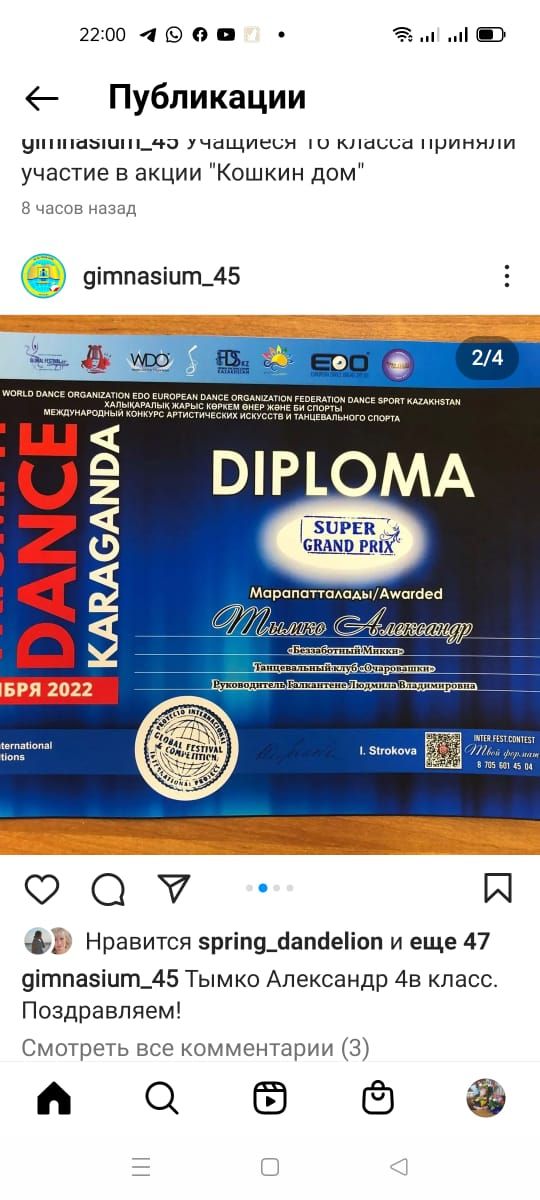 45 гимназияның 3"Ә" сынып оқушысы Оразалы Раяна I Республикалық " Жануарлар әлемінде" атты сурет байқауына қатысып, I дәрежелі дипломмен марапатталды
