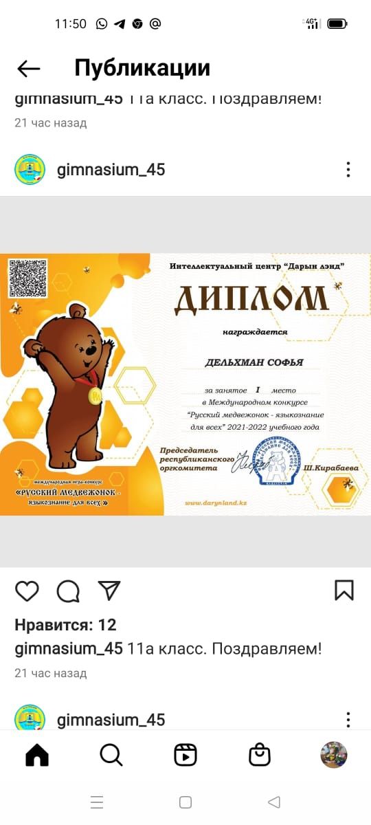 Шмидт Николь ученица 11б класса, КГУ « Гимназия 45» заняла 1 место в международном проекте по воздушной гимнастике. Поздравляем!!!