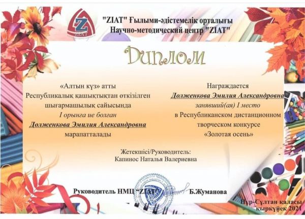 Долженкова Эмилия и Рябчикова Александра, ученицы 4 "В" класса, приняли участие в Республиканском дистанционном творческом конкурсе "Золотая осень". Работы девочек заняли 1 места…
