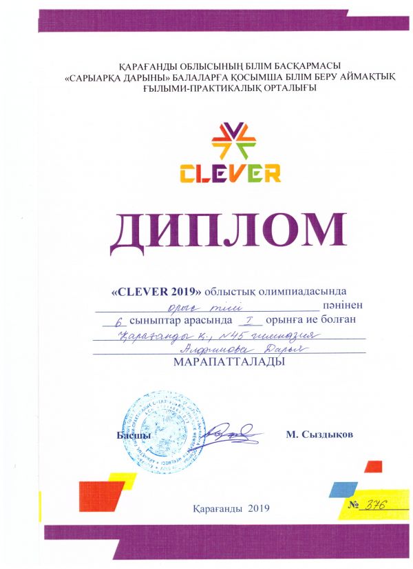 Черноок Анастасия 6 класс заняла 1 место в Республиканской олимпиаде «NIO» по казахкому языку  (руководитель Болатбекова Р.К.)