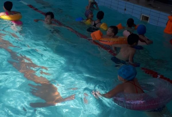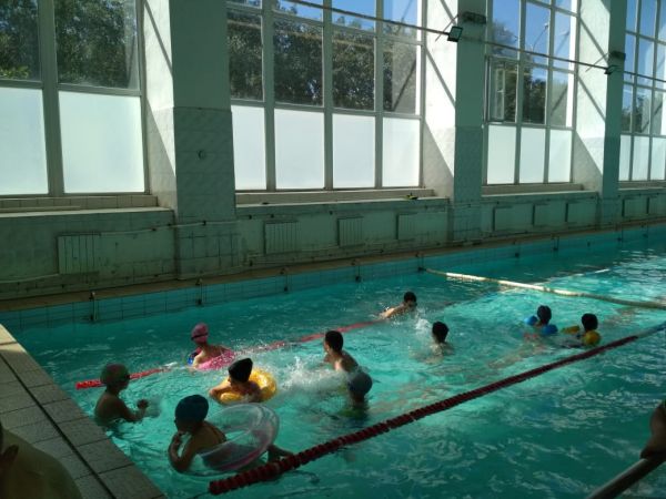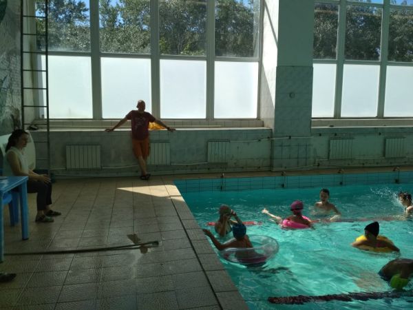 Ребята прошли инструктаж по технике безопасности на воде и отправились в бассейн.