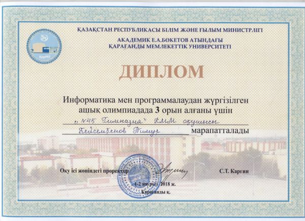1-2 марта в КарГУ им. Е.А. Букетова состоялась открытая олимпиада по информатике и программированию, в которой наша гимназия приняла активное участие. Следующие учащиеся заняли призовые места: Мур…